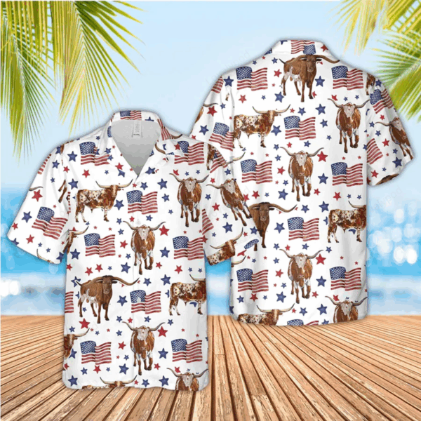 Tx Longhorn American Flag Pattern Hawaiian Shirt, funny cow hawaiian shirt, 4th of july hawaiian shirt