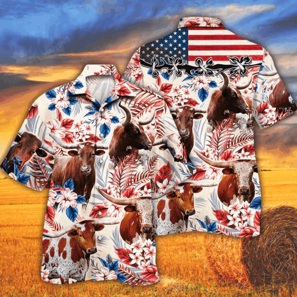 Tx Longhorn Cattle Lovers American Flag Hawaiian Shirt
